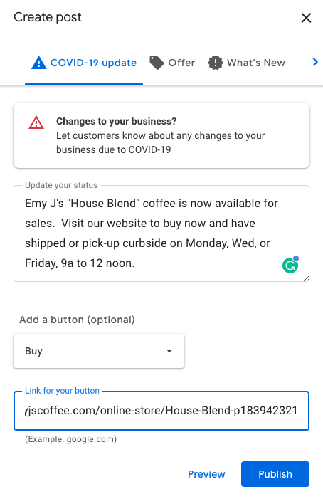On the Home page of your GMB account, look for the hyperlink to “Post your COVID-19 update.”